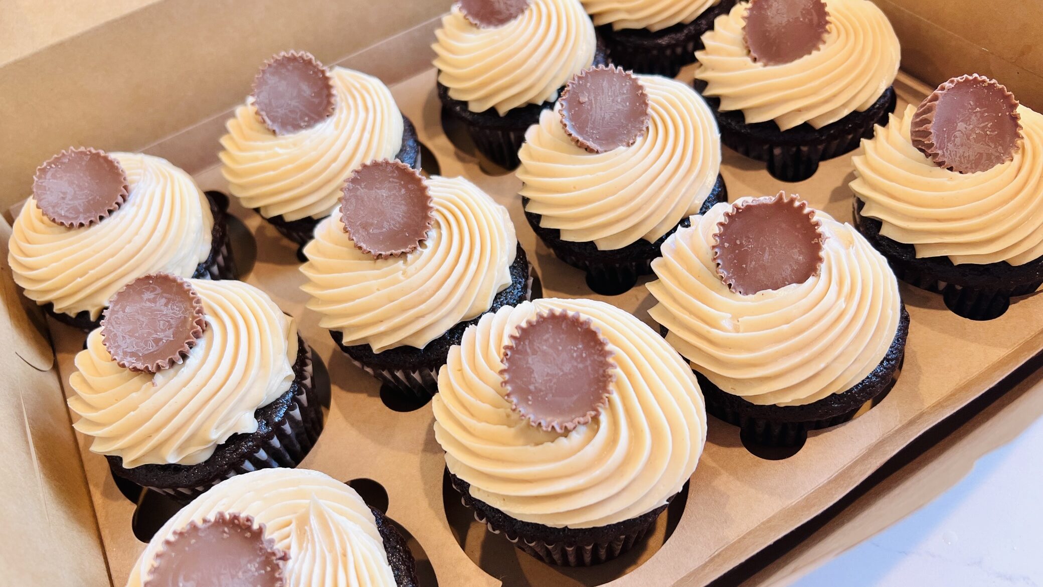 chocolate cupcake, peanut butter buttercream frosting, peanut butter cup garnish