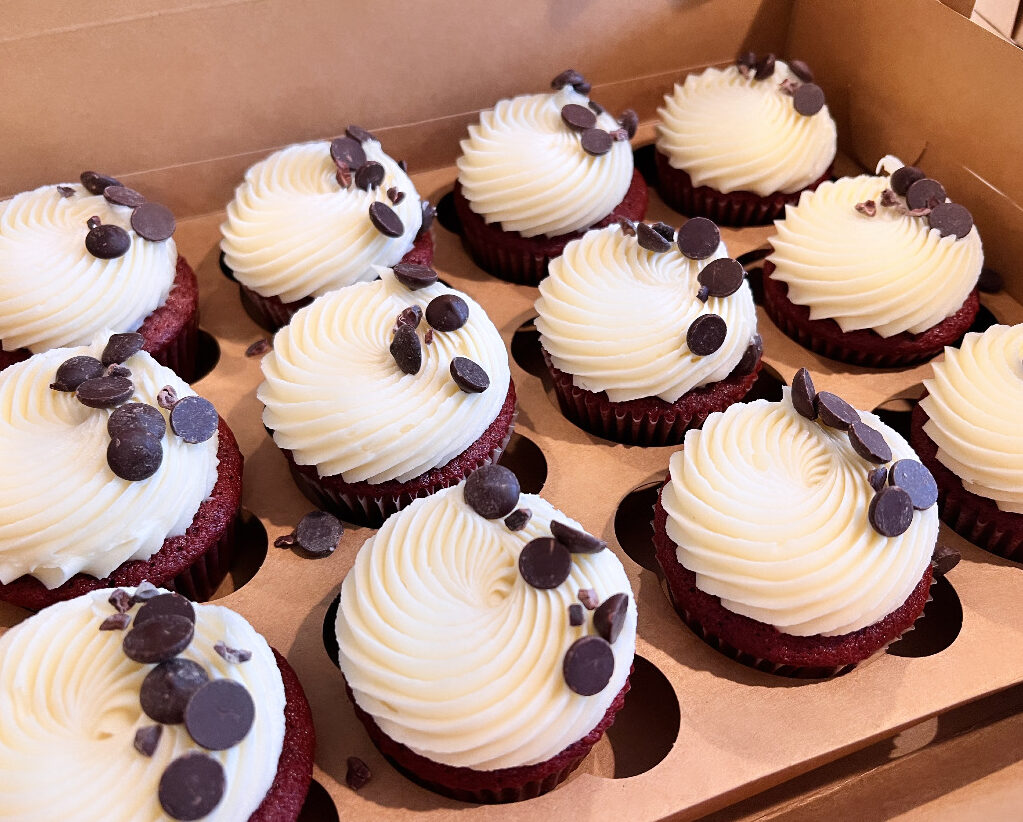 red velvet cupcake , vanilla frosting, chocolate garnish