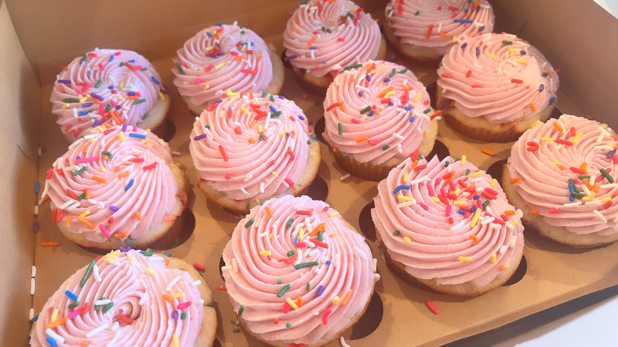 confetti cupcake, strawberry buttercream, marshmallow filling, rainbow sprinkles