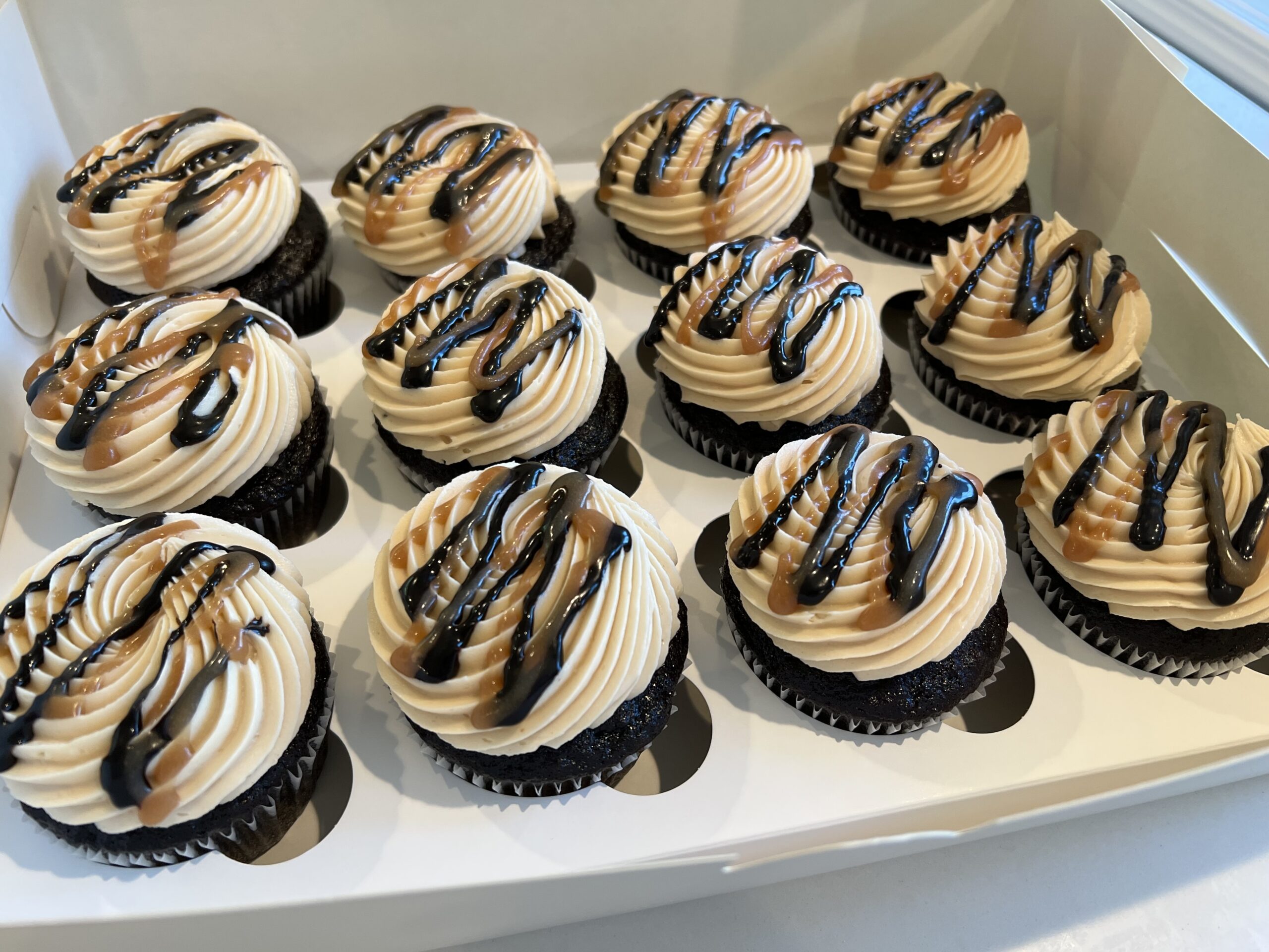 chocolate cupcake, caramel buttercream frosting, toasted pecans, chocolate drizzle