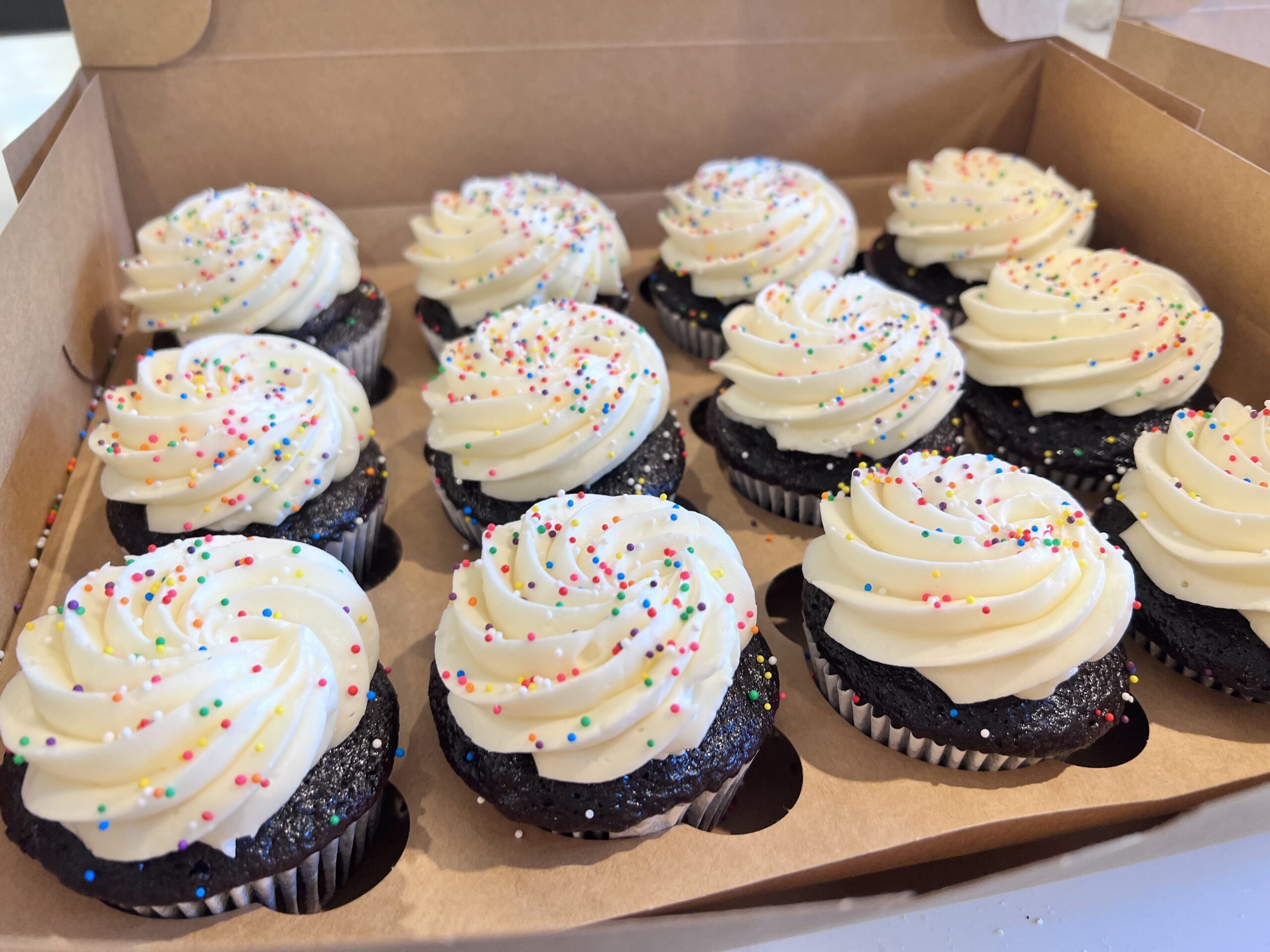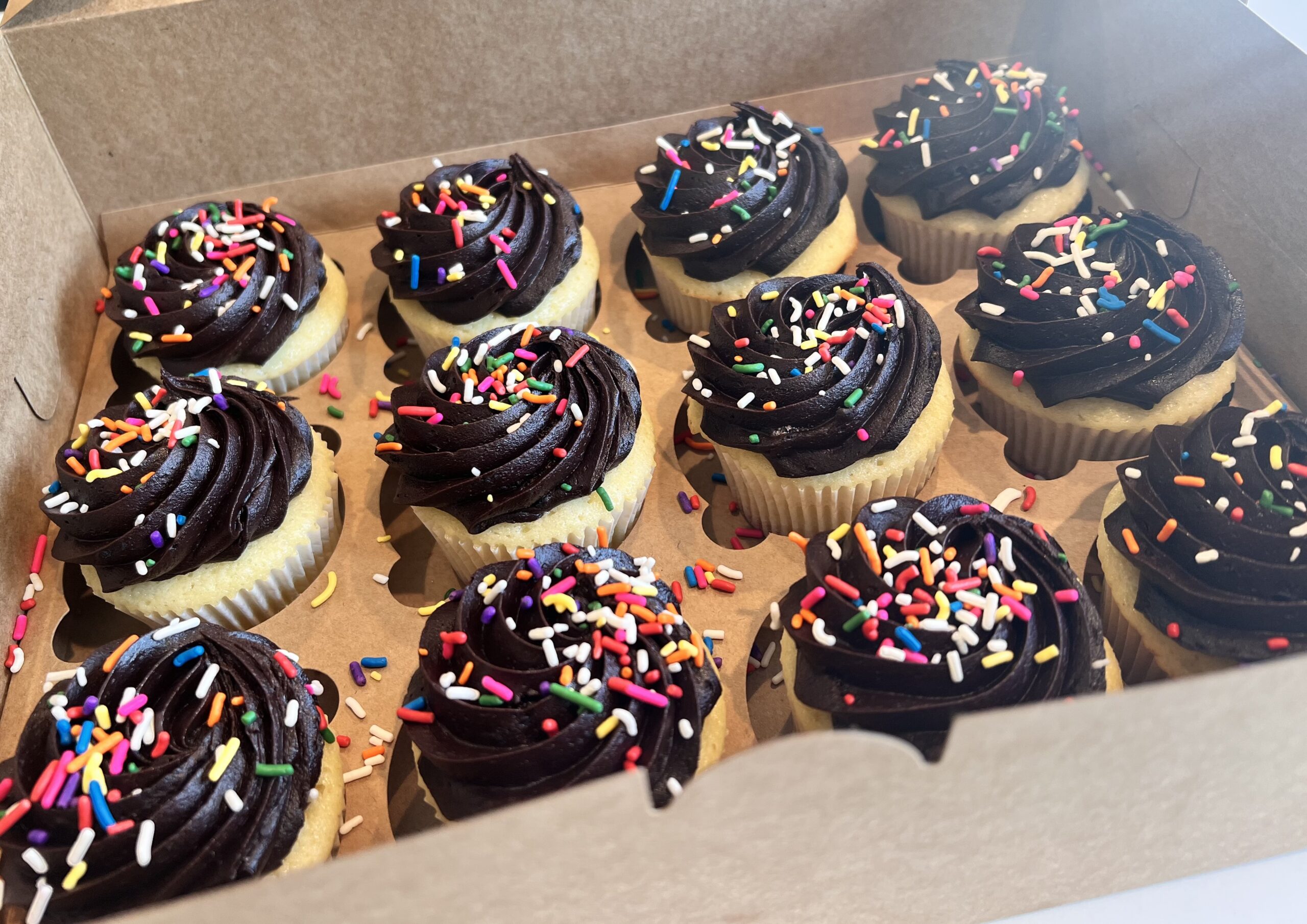 chocolate cupcake, vanilla buttercream, rainbow sprinkles