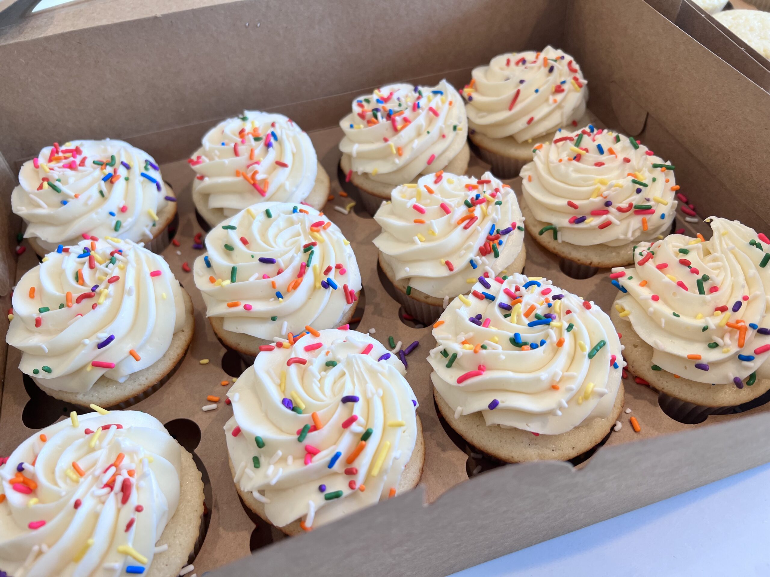 vanilla cupcake, vanilla buttercream, rainbow sprinkles