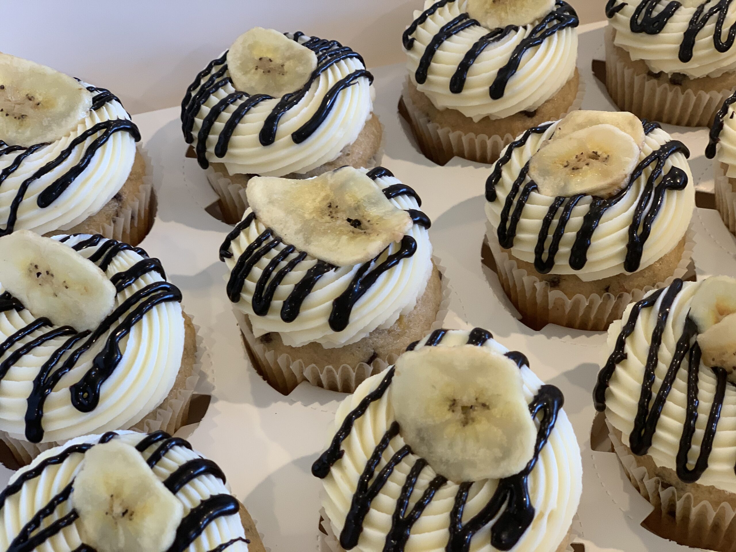 Banana chocolate chip cupcakes, vanilla frosting, fudge drizzle, banana chip