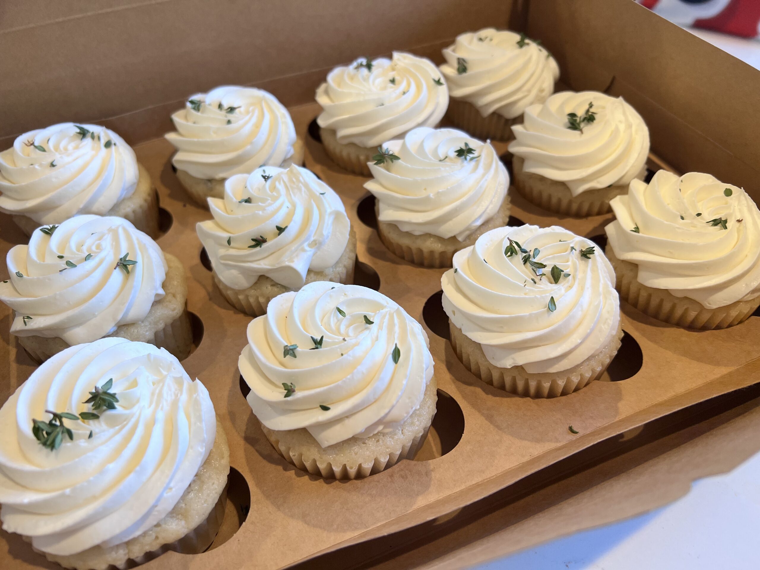 lemon thyme cupcake, lemon curd filling, vanilla frosting, thyme leaves