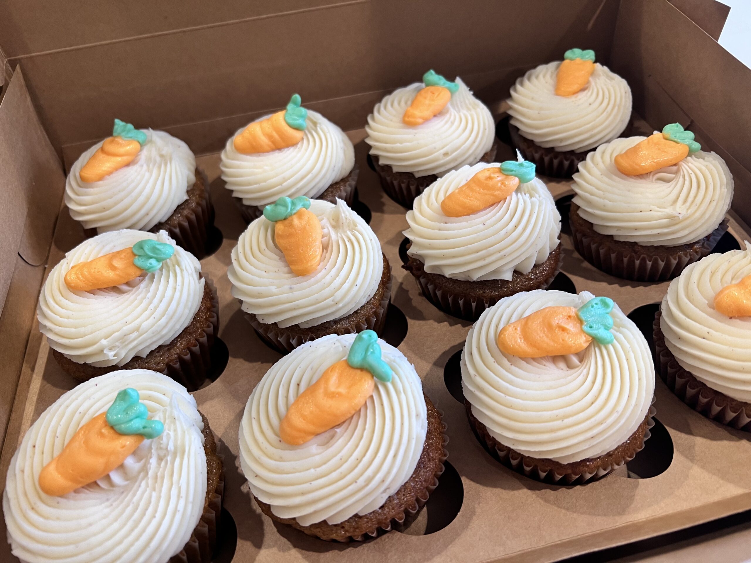 classic carrot cake with brown buttercream frosting, carrot garnish (no nuts)